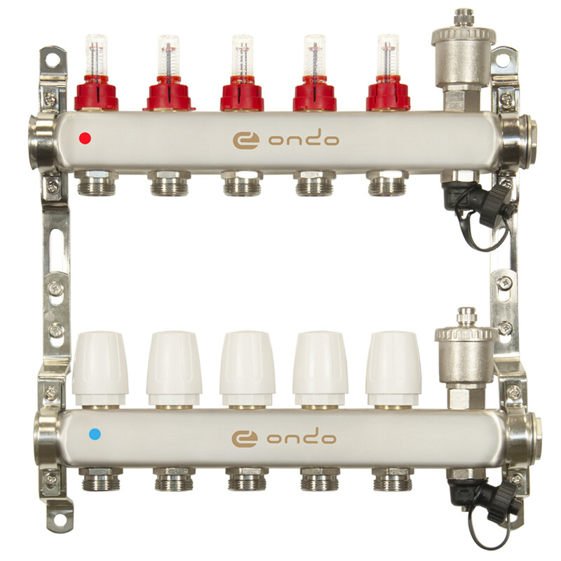СТМ. Коллекторная группа ONDO нерж сталь 5 вых. в сборе с автоматическим воздухоотводчиком, расходомерами и термостатическими клапанами OKGSET05A