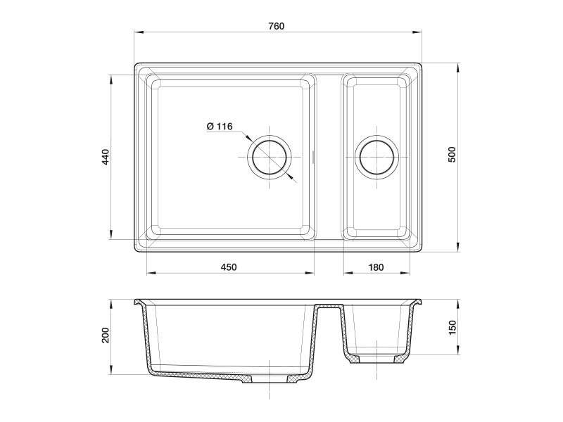 Многофункциональная модель мойки с ударопрочным покрытием имеет два отсека для мытья посуды и продуктов. Благодаря наличию двух чаш можно отсортировать грязную посуду от овощей и фруктов.