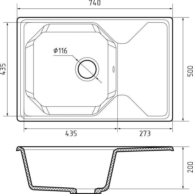 Модель GF - U-740 L — это практичный дизайн удобный в уходе за счет скошенных, не острых углов, и стойкому защитному покрытию ухаживать за такой чашей одно удовольствие. Мойка для кухни подходит как для просторной кухни, так и небольшой и устанавливается в шкаф шириной 500 мм. Хочется обратить внимание на местоположение установки смесителя. Его можно расположить в любой из 4 -х углов. Преимущества модели: 1) Универсальность расположения чаши. Это значит, что основная чаша может располагаться справа либо слева в зависимости от особенностей планировки вашей кухни и потребности в рабочей поверхности. 2) Большая функциональная чаша позволяет разместить внутри крупногабаритную посуду и промывать ее без лишних усилий. 3) Глубина 200мм считается оптимальной для кухонных моек: не приходится напрягать спину и брызги при сильном напоре воды не разлетаются во все стороны. 4) Радиус закругления внутренних углов чаши обеспечивает легкость в уходе.