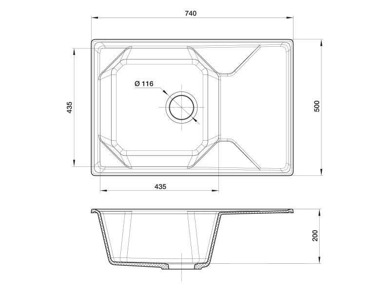 Модель GF - U-740 L — это практичный дизайн удобный в уходе за счет скошенных, не острых углов, и стойкому защитному покрытию ухаживать за такой чашей одно удовольствие. Мойка для кухни подходит как для просторной кухни, так и небольшой и устанавливается в шкаф шириной 500 мм. Хочется обратить внимание на местоположение установки смесителя. Его можно расположить в любой из 4 -х углов. Преимущества модели: 1) Универсальность расположения чаши. Это значит, что основная чаша может располагаться справа либо слева в зависимости от особенностей планировки вашей кухни и потребности в рабочей поверхности. 2) Большая функциональная чаша позволяет разместить внутри крупногабаритную посуду и промывать ее без лишних усилий. 3) Глубина 200мм считается оптимальной для кухонных моек: не приходится напрягать спину и брызги при сильном напоре воды не разлетаются во все стороны. 4) Радиус закругления внутренних углов чаши обеспечивает легкость в уходе.