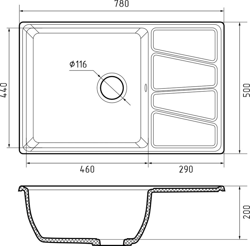 Мойка для кухни GranFest VERTEX GF-V-780L - дизайнерская модель. Ее отличают большая практичная чаша размером 460*440 мм, и глубиной 200 мм, которая с легкостью позволит разместить внутри крупногабаритную посуду и промывать ее без лишних усилий. И многофункциональное широкое крыло, на котором удобно расположить уже вымытую посуду. Или замороженные продукты, по мере таяния с которых будет стекать вода в мойку. Вам не придется использовать лишнюю посуду. Благодаря продуманной эргономике и оригинальному дизайнерскому решению крыла ее можно установить в тумбу шириной 600 мм. Мойка реверсивная (оборачиваемая). Это значит, что основная чаша может располагаться справа либо слева в зависимости от особенностей планировки вашей кухни и потребности в рабочей поверхности. Согласитесь это очень удобно.