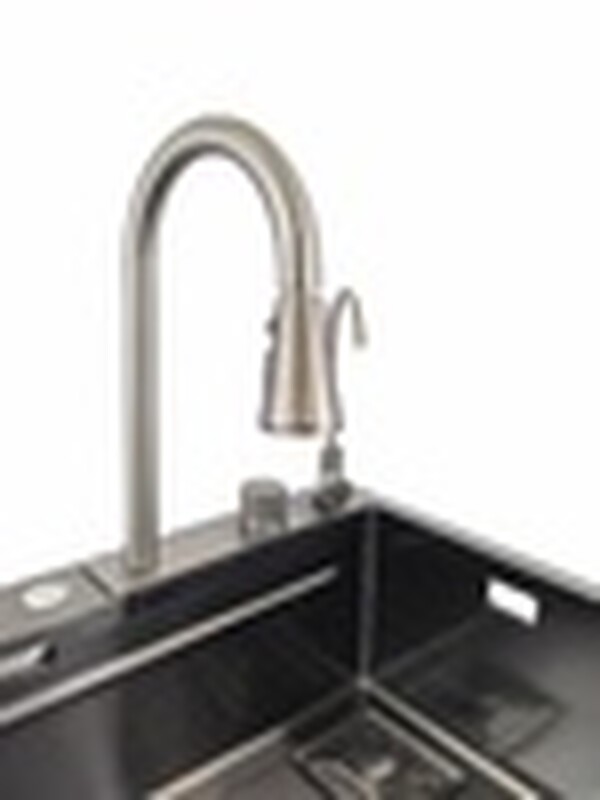 Мойка, комбинированный двойной термостатический смеситель с выдвижной лейкой + водопад, 2 колландера, ополаскиватель стаканов, дозатор, кран для питьевой воды, разделочная доска и 3 1/2'' сифон