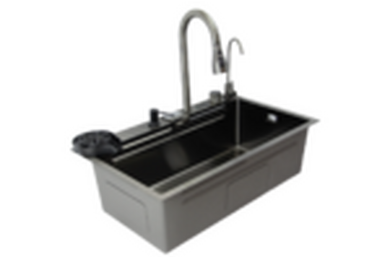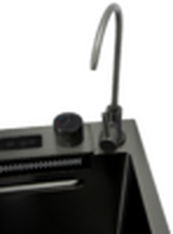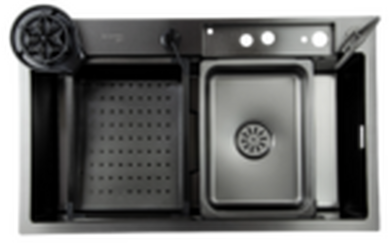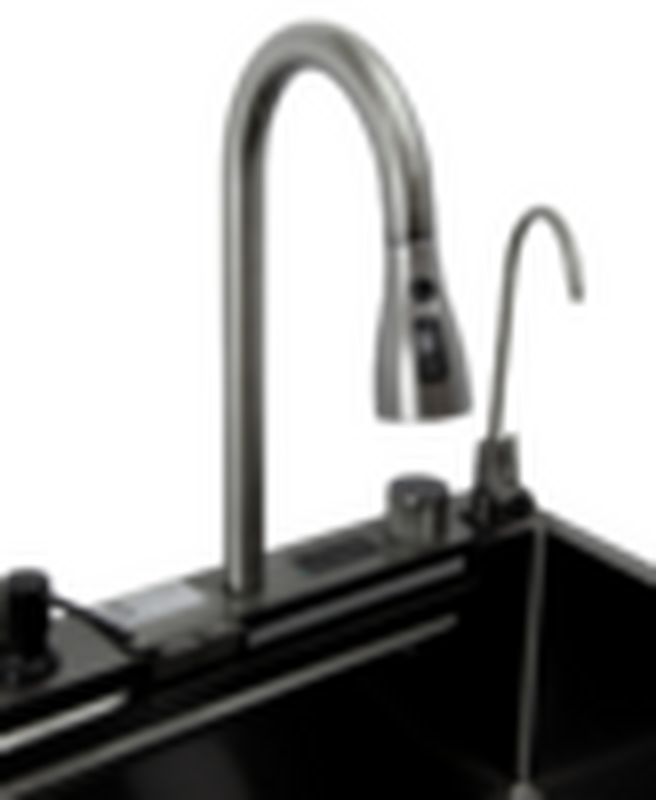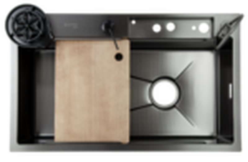 Мойка, комбинированный двойной термостатический смеситель с выдвижной лейкой + водопад, 2 колландера, ополаскиватель стаканов, дозатор, кран для питьевой воды, разделочная доска и 3 1/2'' сифон