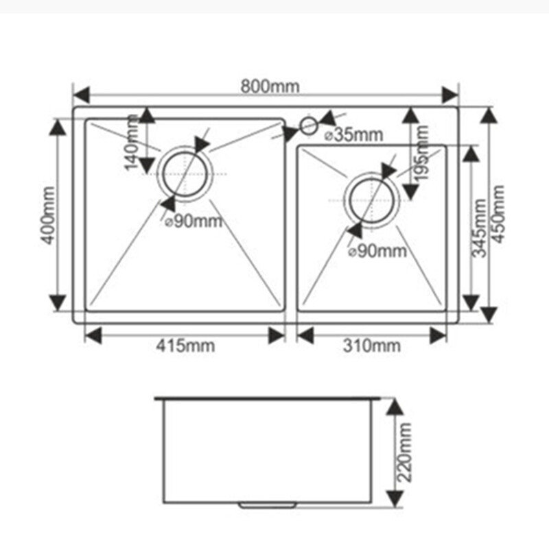 Мойка нерж врезная 800х450х220 т 3,0 САТИН 2-я ЧАША S8045H сатин AISI 304 MLN