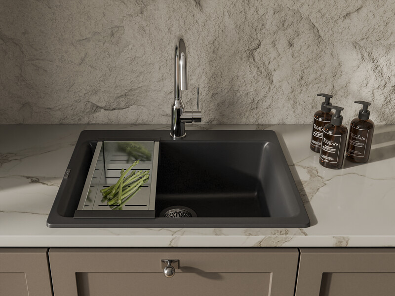 Многофункциональный коландер для удобного мытья продуктов или сушки посуды устанавливается на бортики чаши.