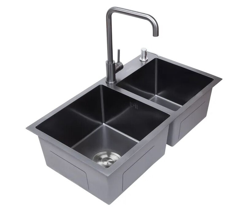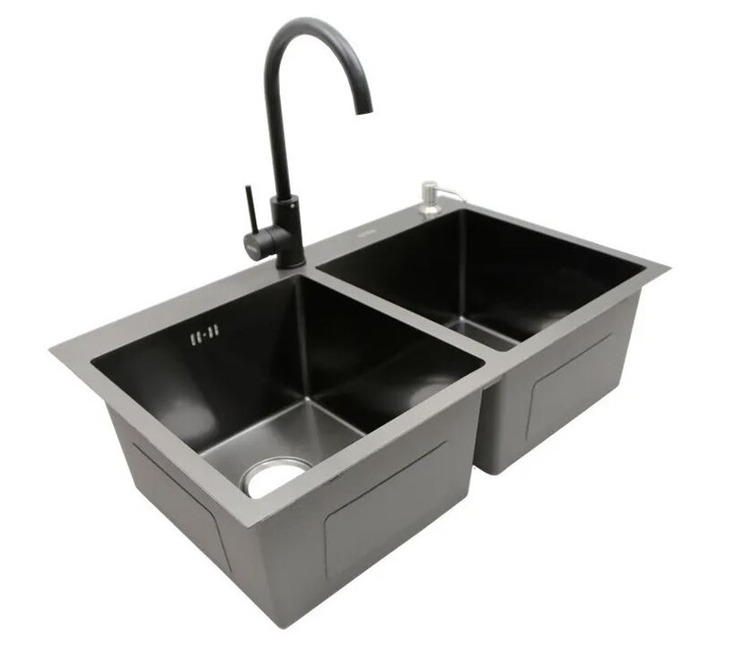 Avina. Мойка нерж врезная 780x480х230 т (3,0+1.2mm) черная НМ 7848/2 ДВОЙНАЯ (+ сифон, колландер, дозатор мыла) AISI 304