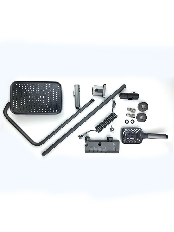 Комплектация: аэратор, керамический картридж 28 мм, шланг 1,5 м, настенное крепление, 1-функциональная лейка, металлическая рукоятка, стойка, верхняя лейка «Тропический душ»