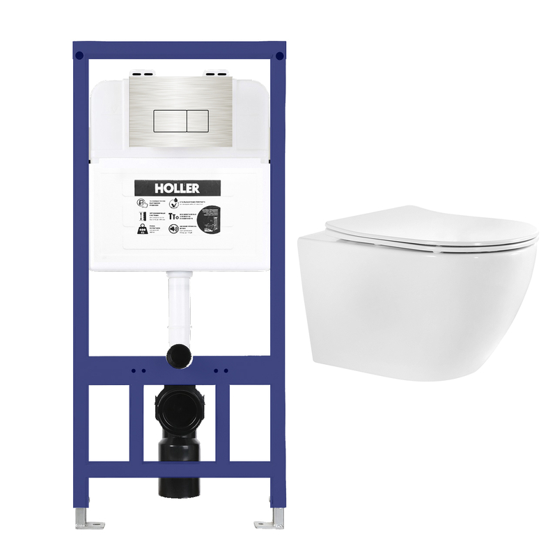 Инсталляция HOLLER MQ102 (комплект 3 в 1) + Унитаз подвесной безободковый (Торнадо) HOLLER NEXT T, белый + Клавиша смыва HOLLER BMSV, матовый сатин