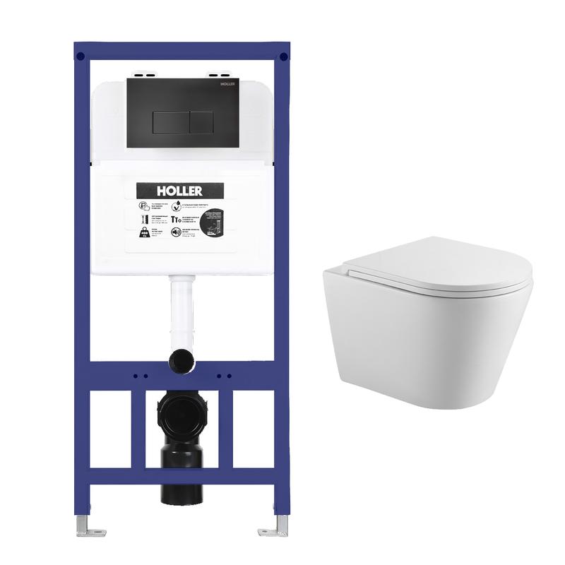 Инсталляция HOLLER MQ102 (комплект 3 в 1) + Унитаз подвесной безободковый HOLLER SHELL, белый + Клавиша смыва HOLLER MBV, черн матовый