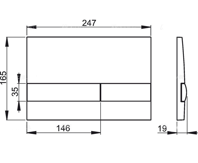 Клавиша слива для инсталляции. Устанавливается фронтально и состоит из двух клавиш управления. Экономичный режим, включаемый малой клавишей, уменьшает расход воды. Полный сливает всю воду из бачка и обеспечивает качественную очистку чаши.