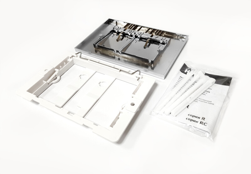 Клавиша слива для инсталляции. Устанавливается фронтально и состоит из двух клавиш управления. Экономичный режим, включаемый малой клавишей, уменьшает расход воды. Полный сливает всю воду из бачка и обеспечивает качественную очистку чаши.