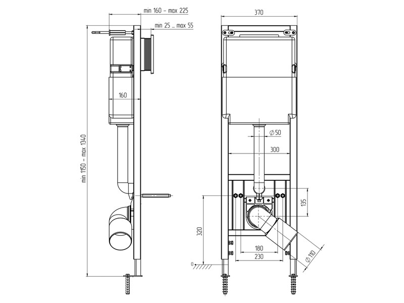 Размеры инсталляции (В х Ш х Г) мм. - 1150–1350 (регулируемая) х 370 х 160-225 (регулируемая).