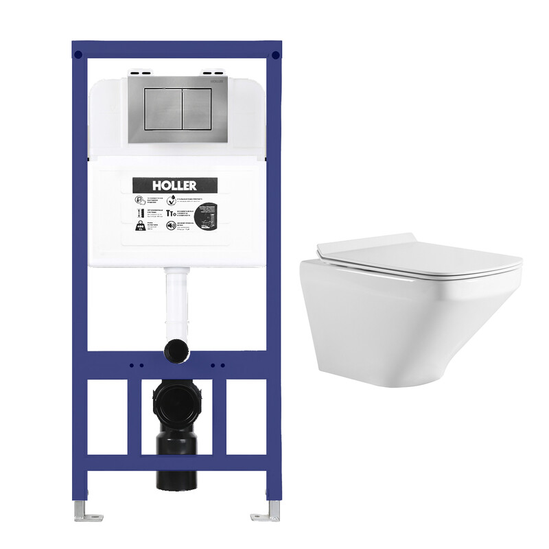 Инсталляция HOLLER MQ100 (комплект 3 в 1) + Унитаз подвесной безободковый HOLLER BLOCK, белый + Клавиша смыва HOLLER GPR, хром