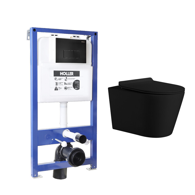 Инсталляция HOLLER MQ100 (комплект 3 в 1) +Унитаз подвесной безободковый (Торнадо) HOLLER WIND_MB, черный мат + Клавиша смыва HOLLER MBV, черный мат