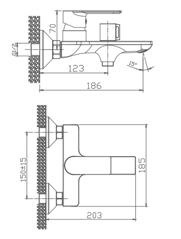 Керамический картридж 35 мм. Диаметр декоративных чашек 70 мм. Душевой гарнитур в комплекте. Межосевое расстояние (расстояние между выходом горячей и холодной трубы) 150 мм. Данное расстояние изменяется за счет входящих в комплект эксцентриков на 15 мм в большую или меньшую стороны.
