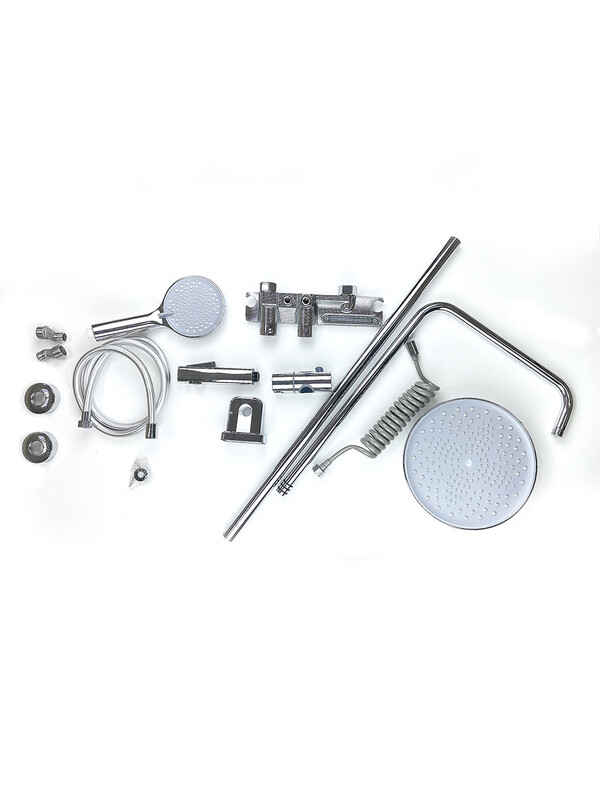 Смеситель, лейка душевая, держатель лейки душевой, лейка тропическая, лейка гигиеническая, шланг душевой, шланг для гигиенической лейки, стойки душевые 2 шт, крепление стойки к стене, эксцентрики 2 шт. и отражатели 2 шт, паспорт