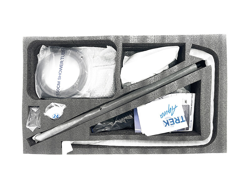 Смеситель, лейка душевая, держатель лейки душевой, лейка тропическая, лейка гигиеническая, шланг душевой, шланг для гигиенической лейки, стойки душевые 2 шт, крепление стойки к стене, эксцентрики 2 шт. и отражатели 2 шт, паспорт