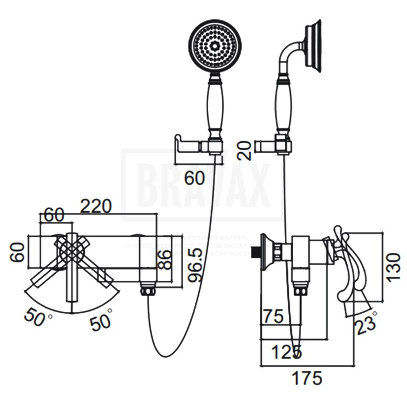 В комплекте: душевой шланг 150 см, душевая лейка, держатель лейки, комплект отражателей, комплект эксцентриков