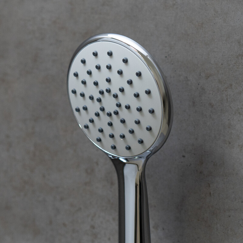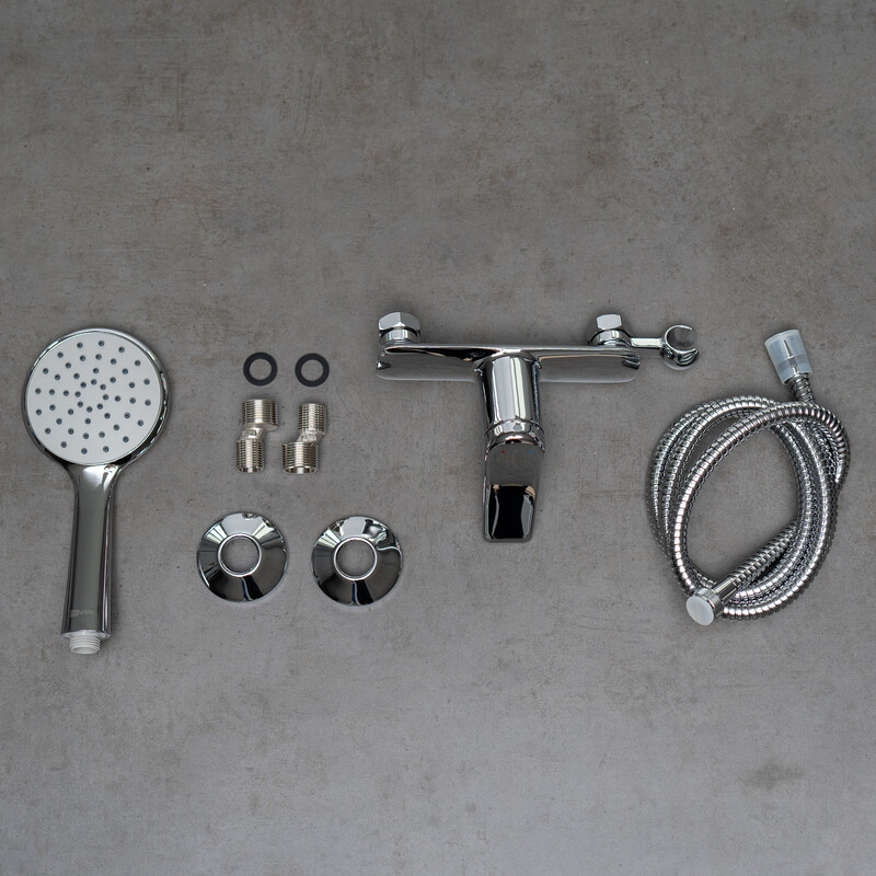 1) Керамический картридж 35 мм; 2) Аксессуары в комплекте: 1-функциональная лейка Ø106×235 мм, душевой шланг 1,5 м; 3) Присоединительная группа для настенного крепления ½”; 4) Металлическая рукоятка.