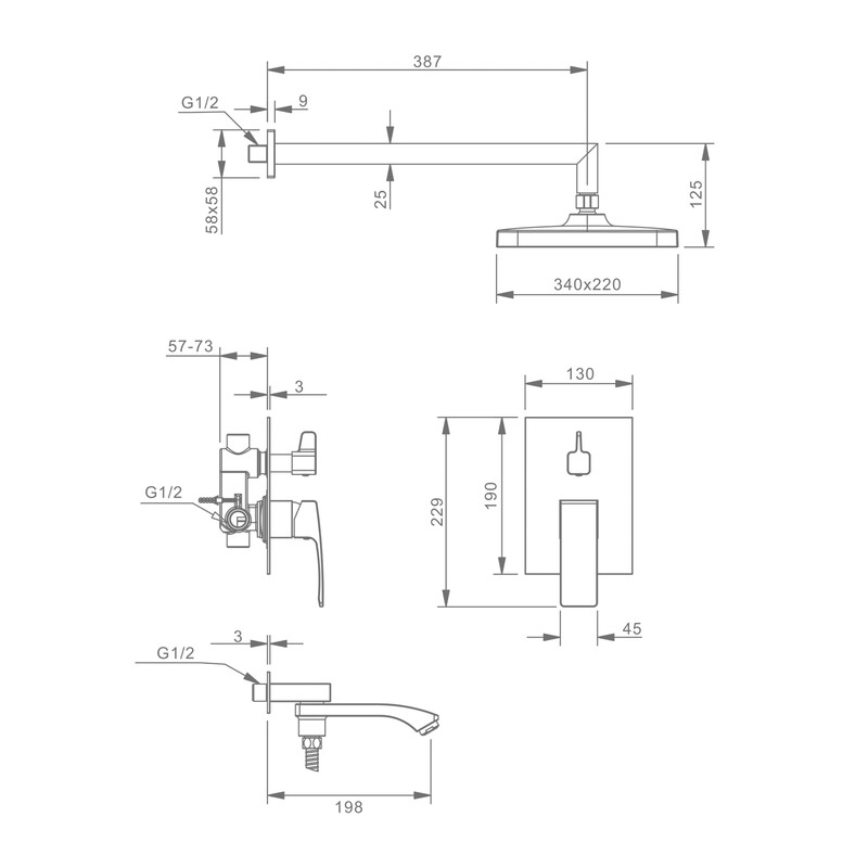 Керамический картридж 35мм - R500.35; Переключатель с керамическими пластинами (угол поворота – 90°) - R501.526A; Переключатель в изливе - R501.527; Излив - функция переключения; Аэратор для водопроводной воды Neoperl с функцией самоочистки - R540.02.09; Душевой шланг нержавеющая сталь 1.5м - R402.15.09; Душевая лейка - 3 режима (пластик/силикон); Верхний душ - 340*220мм (пластик/силикон); Держатель лейки; Ключ для аэратора; Паспорт изделия, инструкция по монтажу, гарантийный талон.
