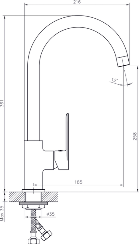 В смеситель установлен картридж D-35 с керамическими пластинами. Высота смесителя 361 мм. Излив поворотный, 185 мм. Высота излива до аэратора 258 мм. Аэратор изготовлен из пластика с нержавеющим корпусом, угол наклона аэратора- 12 гр.