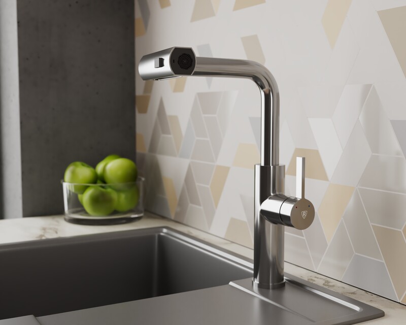 Смеситель для кухни с высоким поворотным изливом и вытяжной лейкой 3-функц. RUSH Tinos арт.TI3732-18 цвет сатин с металлической ручкой изготовлен из нержавеющей стали SUS304 и имеет рычажное управление.
