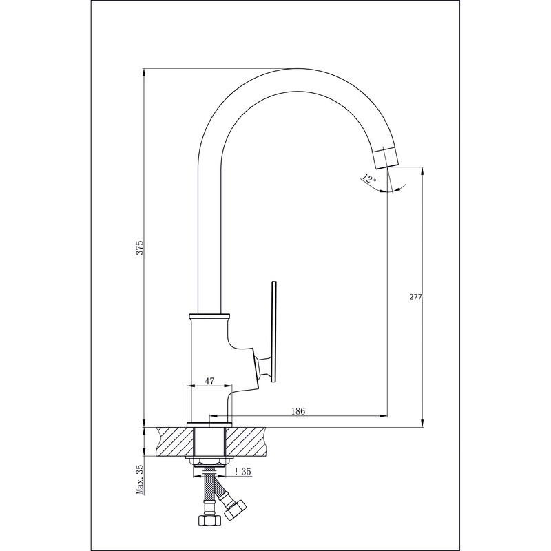 В смеситель установлен картридж D-30 с керамическими пластинами. Высота смесителя 375 мм. Излив поворотный 186 мм. Высота излива до аэратора 277 мм. Аэратор изготовлен из пластика с нержавеющим корпусом, угол наклона - 12 гр.