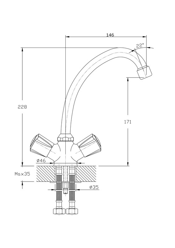 В смеситель установлены кран-буксы (RSH502) с керамическими пластинами. Высота смесителя 228 мм. Излив поворотный (360гр), 146 мм. Высота излива до аэратора 171 мм. Аэратор изготовлен из пластика с нержавеющим корпусом, угол наклона - 22 гр.