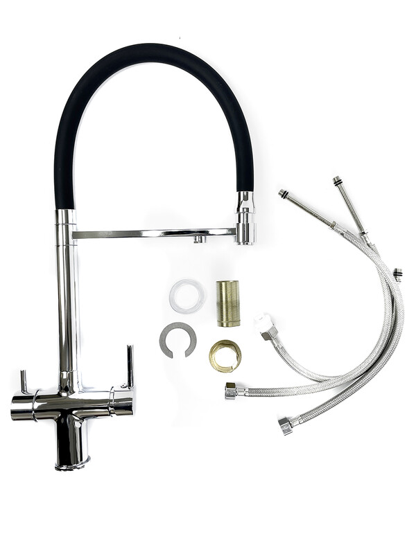 Смеситель, гайка крепления, подводка для воды 2 шт, подводка для воды с переходником для фильтра, паспорт