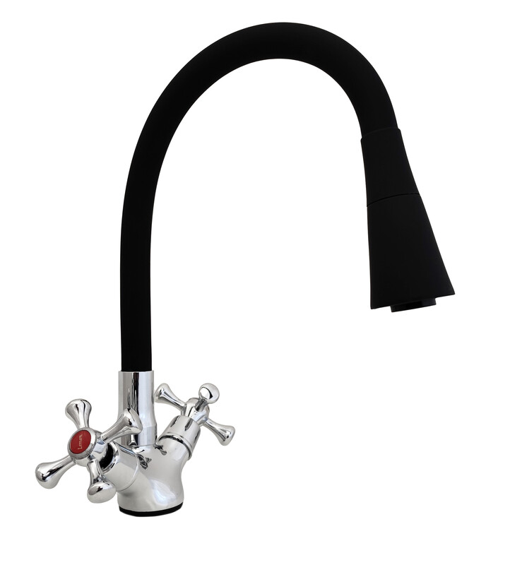 Смеситель Кухня Lemen мах Крест (LD 91665 Е8) хром, черный гибкий излив с лейкой-аэратором,гайка,цинк
