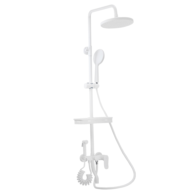 Душевая система SANTREK AQUA-1216 "PRESTIGE" (SAP-1216) шар. d-35 с верхним душем, смесителем, гигиен лейкой и полочкой (белый)