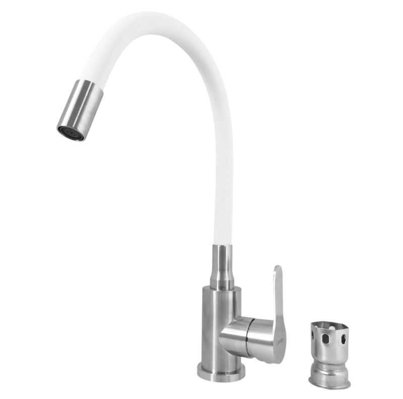 Смеситель кухня Lemen D35 (нержавейка, гибкий белый излив,гайка) G99303 - W9
