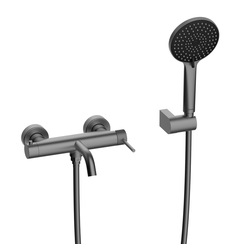 LMF-2026S-GM Karelia Смеситель для ванны с верхней лейкой 23 см (пластик), с изливом, с аксес-ми, латунь, графит LEMARK