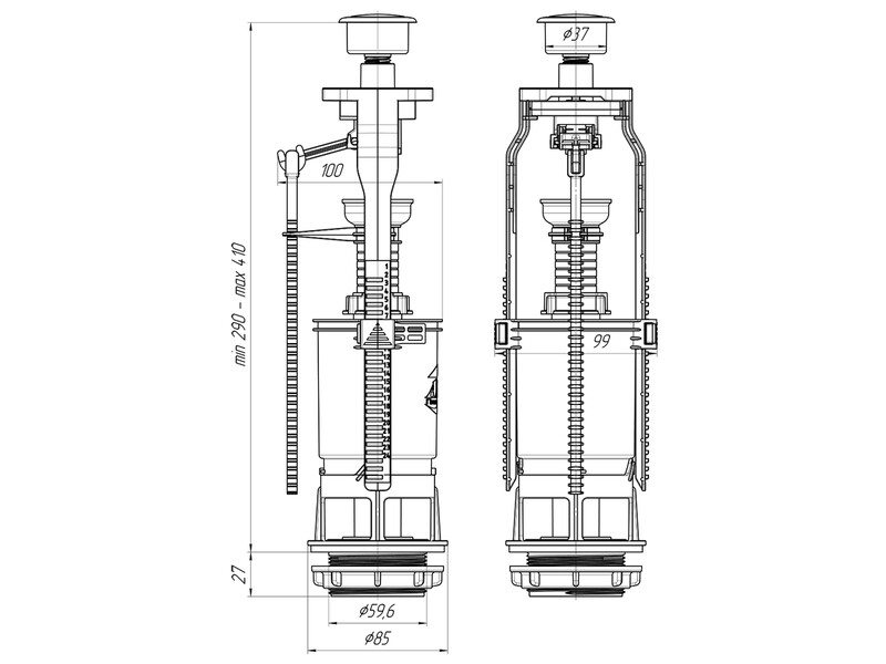 Сливной механизм бачка унитаза АНИ пласт WC7030M эконом, металлизированная кнопка, с одним режимом слива. Регулировка по высоте 290-410 мм. Отверстие для кнопки слива в крышке бачка 40 мм, посадочное отверстие сливной арматуры 60 мм.