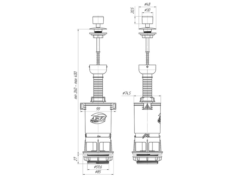 Сливной механизм металлизированная ручка со штоковым режимом слива, регулировка по высоте 260-400 мм. Отверстие под ручку слива в крышке бачка от 25 до 40 мм, посадочное отверстие сливной арматуры 60 мм.