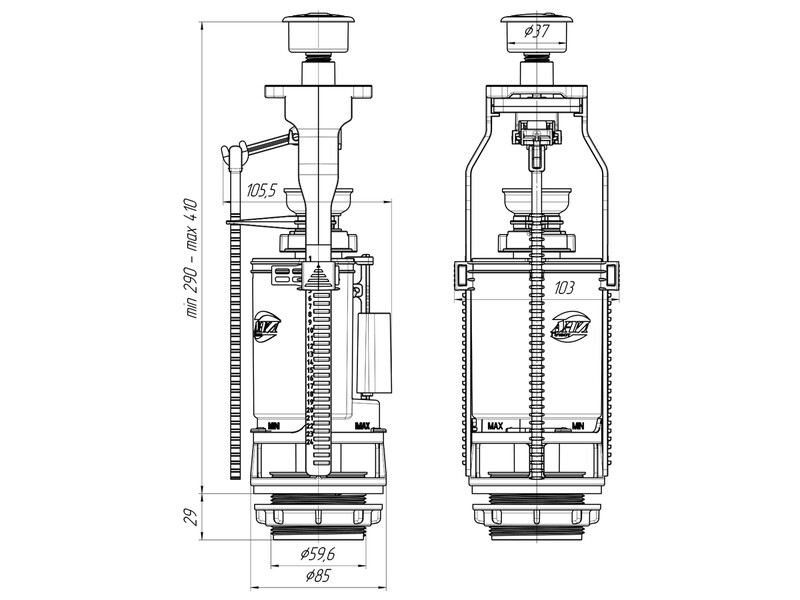 Сливной механизм бачка унитаза АНИ пласт WC7050М с двойной металлизированной кнопкой, с двойным режимом слива. Регулировка по высоте 290-410 мм. Отверстие для кнопки слива в крышке бачка 40 мм, посадочное отверстие сливной арматуры 60 мм.