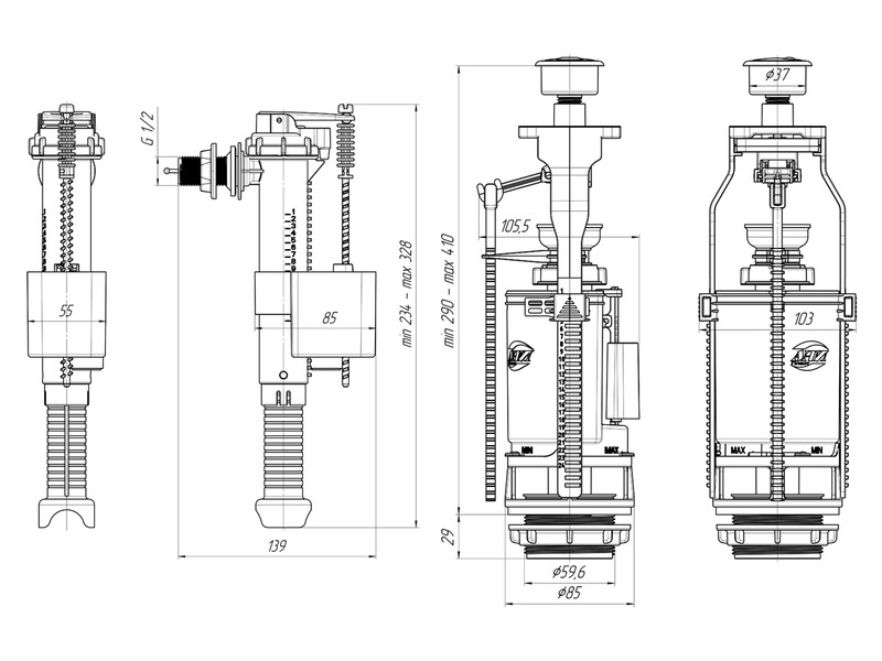 Набор для бачка унитаза АНИ пласт WC9010C. Наливной механизм с верхней боковой подводкой и пластиковой резьбой диаметром 1/2"", регулировка по высоте 234-328 мм.