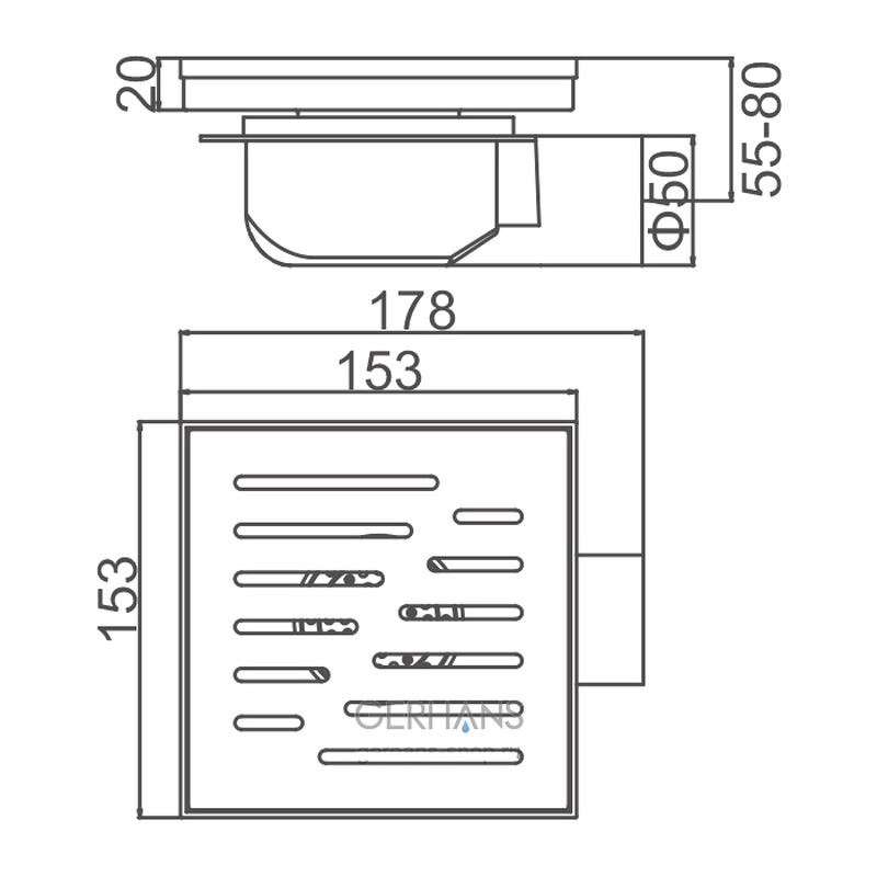 K81915-15 Трап 50 вертикальный GERHANS латунь 150*150 (хром)
