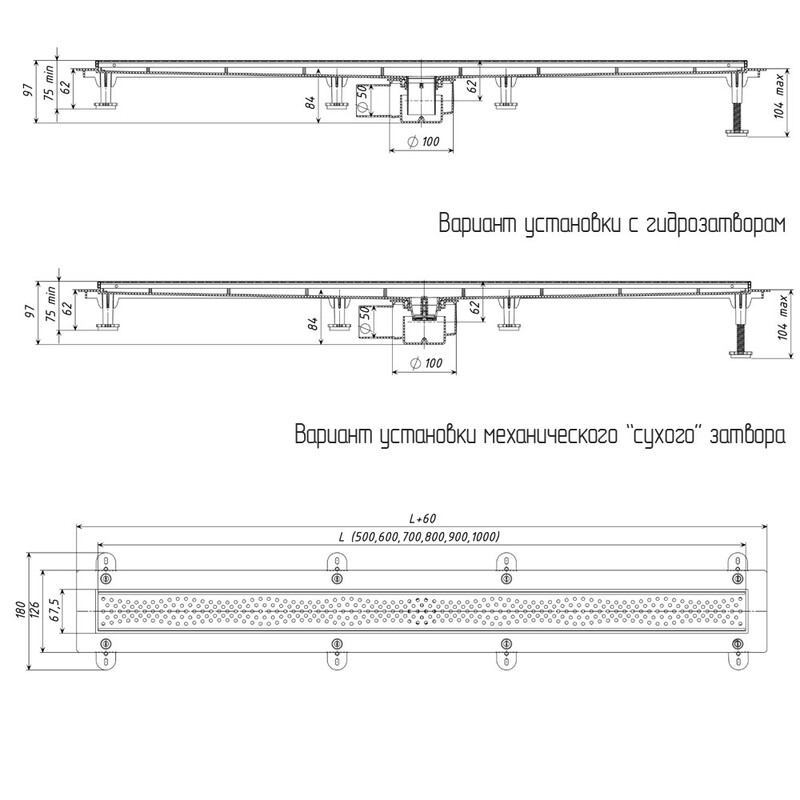 Трап линейный ABS-пластик, сухой + гидрозатвор, 70х 500мм (горизонт выпуск,ф50), нерж решетка типа A (волна) (ТП-55.1A-500)