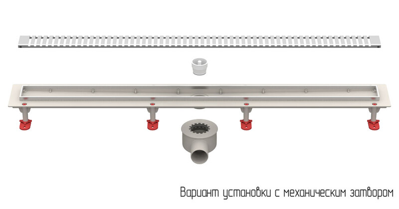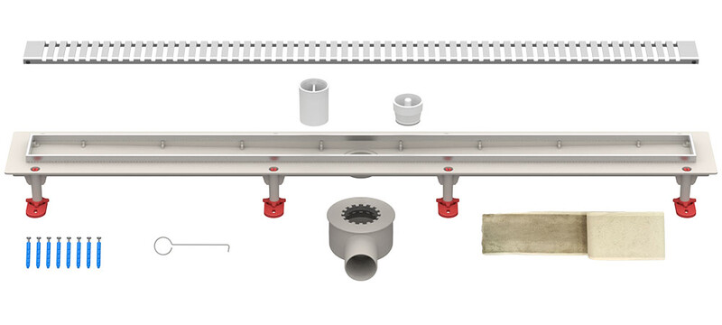 Душевой трап с рамкой – 1 шт., Устройство для снятия решетки – 1 шт., Набор крепежей – 1 компл., Гидроизоляционная лента – 1 компл., Упаковка – 1 шт.