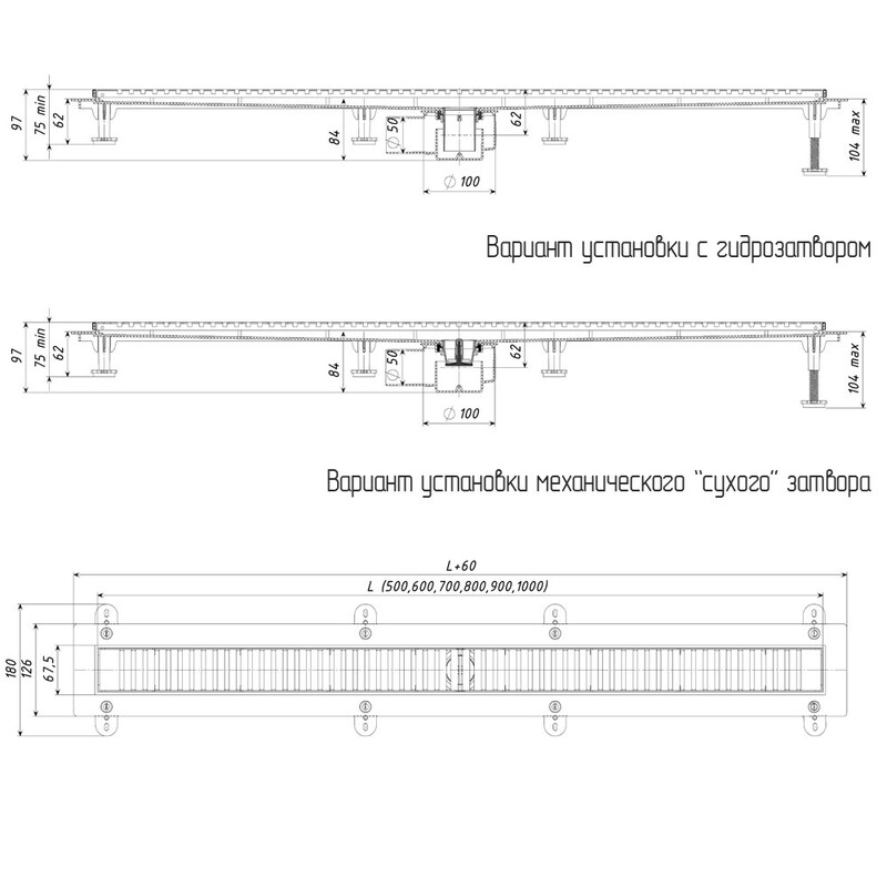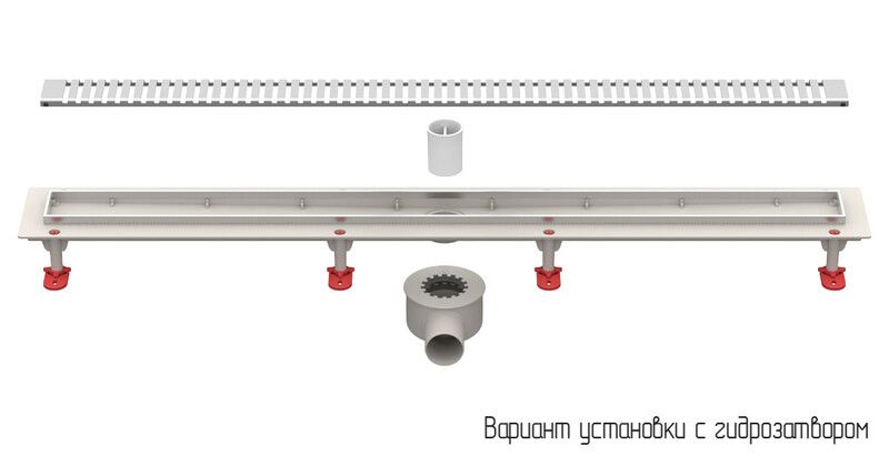 Трап линейный ABS-пластик, сухой + гидрозатвор, 70х 800мм (горизонт выпуск,ф50), нерж решетка типа D (полосы) (ТП-55.1D-800)