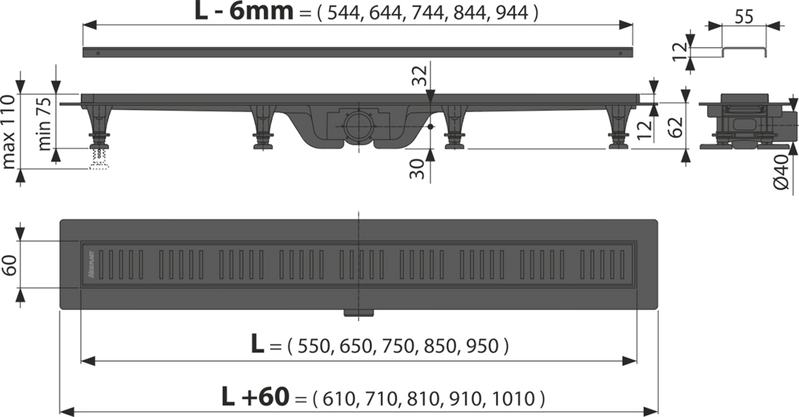 Водоотводящий желоб ALCAPLAST с порогами для перфорированной решетки, (APZ10BLACK-750M) Чехия