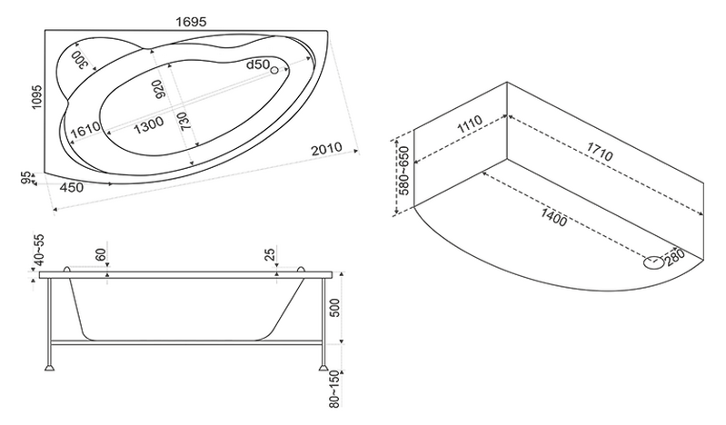 - наличие идеальной геометрии по горизонтальной плоскости борта дает возможность устанавливать на борт ванны шторки.