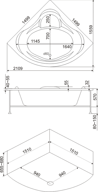 Глубина ванны по центру — 500 мм