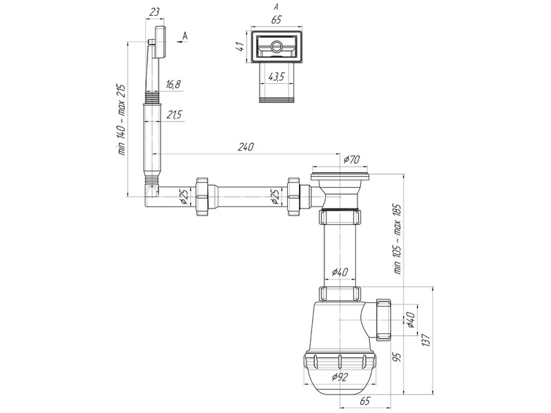 Сифон для кухонной мойки бутылочного типа. С разборным выпуском и нержавеющей решеткой и жестким прямоугольным переливом.Выход для подключения к канализации 40мм