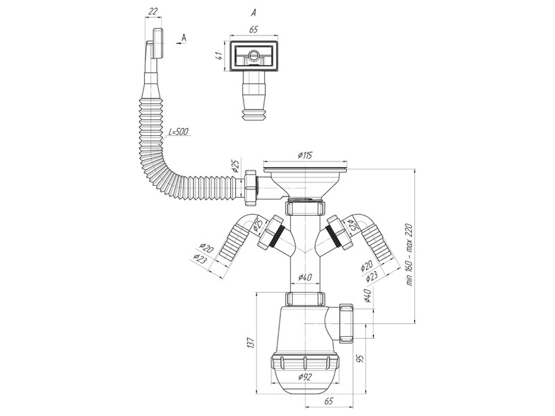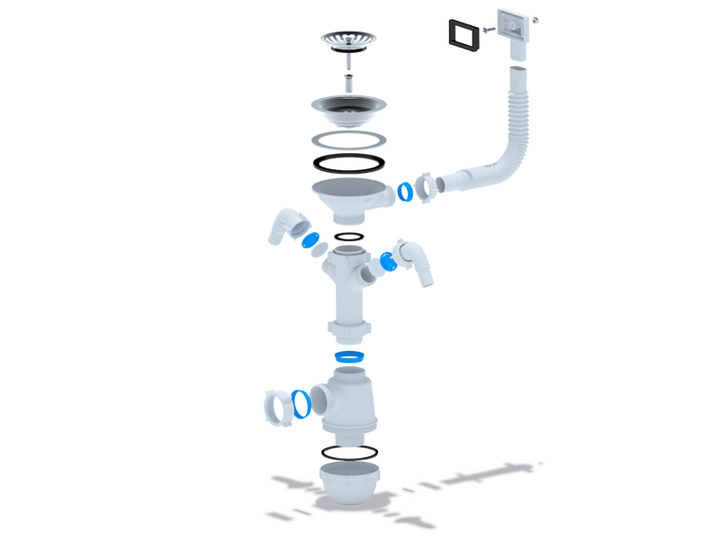 Сифон для кухонных моек с диаметром сливного отверстия 90мм, бутылочного типа с увеличенным корпусом. С разборным выпуском и нержавеющей решеткой, с гибким прямоугольным переливом для моек из нержавеющей стали. Корпус перелива оборудован универсальной прокладкой для круглых и прямоугольных моек, нужная сторона прокладки достигается путем переворота. С двумя отводами для подключения бытовой техники. Выход для подключения к канализации 40мм