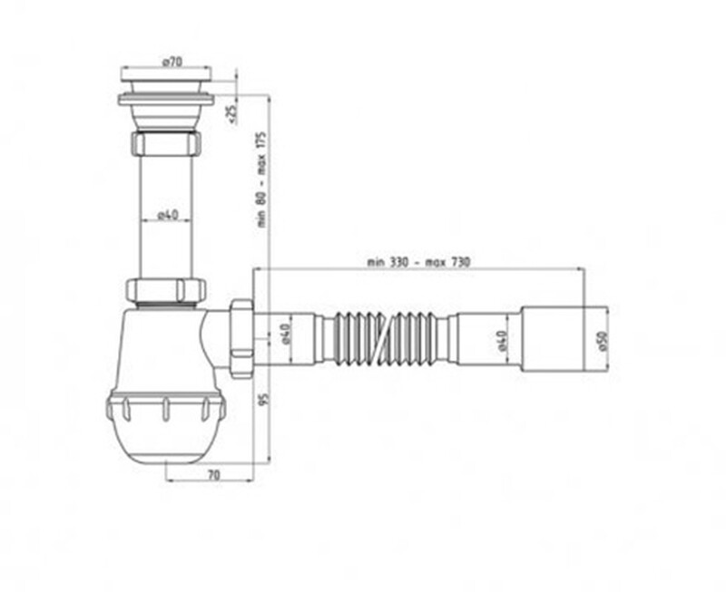 Сифон для кухонной мойки бутылочного типа. С литым выпуском и нержавеющей решеткой, для подключения к канализации комплектуется гофрой 40х40/50