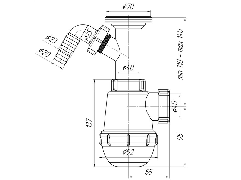 Сифон для кухонной мойки бутылочного типа. С литым выпуском и нержавеющей решеткой. Есть выпуск для подключения с/м.Выход для подключения к канализации 40мм