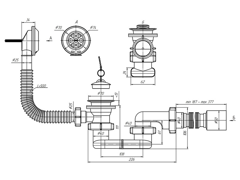 Для ванн с отверстием слива Ø50 мм и отверстием перелива от 36 до 63 мм (стандартное отверстие 50 мм)