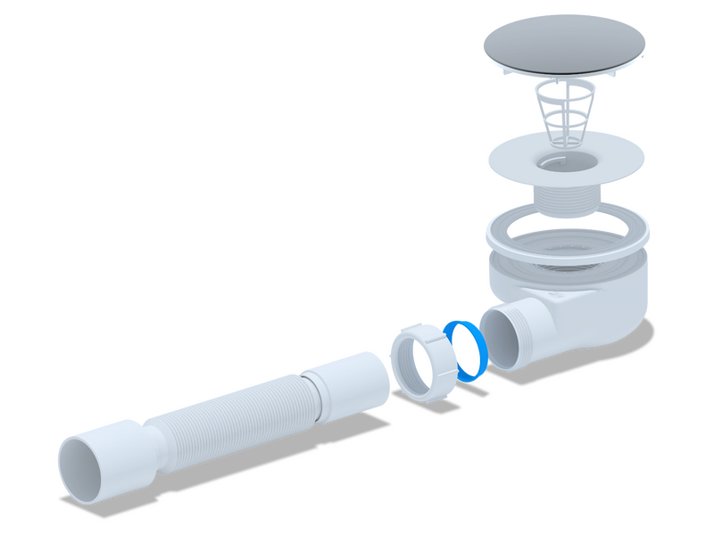Сифон для душевого поддона со сливным отверстием 90мм. Монтажная высота 53мм. Крышка сифона покрыта нержавеющей сталью толщиной 0.3мм. Подключение к канализации 50 с помощью трубы 45 градусов. Вальцовка